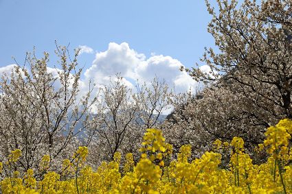 在瀘定縣冷磧鎮(zhèn)、德威鎮(zhèn)等地,桃花、油菜花及櫻花競相開放,一團團、一簇簇,綴滿枝頭,藍天、白云與各色花兒相交,金黃花海在微風(fēng)中起伏。一畦畦油菜花田錯落有致、層次分明,綿延不斷?!岸聶鸦ㄩ_,三月桃花盛,四月紅櫻桃,五月水蜜桃?!背擞筒嘶?,每年陽春三月,瀘定的桃花也隨著和煦春風(fēng)落滿枝頭滿樹的花芽沁著香氣,一點點溢到空氣中,香了春風(fēng),也香了整座城。