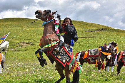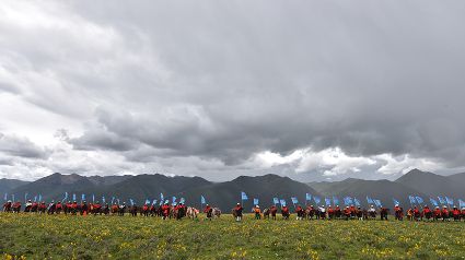 花海上、馬匹間,康巴漢子摩拳擦掌;藍(lán)天下、溪流旁,盛裝觀眾搖旗吶喊。19日,作為運(yùn)動(dòng)會(huì)的分項(xiàng)活動(dòng)之一,德差鄉(xiāng)羊格貢草原上演了一場(chǎng)500匹駿馬在康巴漢子駕馭下同場(chǎng)飛奔的馬術(shù)表演視覺(jué)盛宴。伴隨著鏗鏘有力的馬蹄聲、駿馬的嘶鳴聲和觀眾的歡呼聲,一幅集奔騰之美、力量之美、風(fēng)光之美于一體的壯美畫(huà)卷快速閃過(guò)觀眾眼簾。
