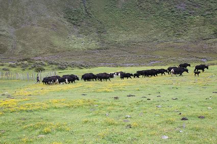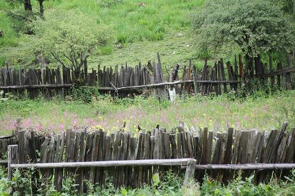 隨著海拔高度的升高與緯度的增加,一路上的植被類(lèi)型也在不斷發(fā)生著變化。穿越深闊的暗針葉林,六匹馬起起落落的腳力踩出了一個(gè)馬幫的回音,所有的植物在各自的生命活動(dòng)中散發(fā)出了清新怡人的芬多精,吉美為此小聲哼唱起了愉悅的歌兒,細(xì)聽(tīng)卻又像是兩只云雀在不遠(yuǎn)處鳴囀。再往上走,周遭的林木又轉(zhuǎn)換成了密致的高山杜鵑林,無(wú)數(shù)修長(zhǎng)的木流蘇垂掛在樹(shù)枝上,像哈達(dá)。一路沉默的南杰轉(zhuǎn)頭來(lái)開(kāi)始與我說(shuō)話(huà)“六月間,這里的每一棵樹(shù)都開(kāi)滿(mǎn)了粉白的花朵,一樹(shù)樹(shù)的煞是壯觀好看,我一個(gè)人經(jīng)過(guò),總能聽(tīng)到一朵、兩朵花鈍落的聲音。最初,我以為是馬雞飛落了,輕聲走入林中打探,身后又會(huì)落下一朵、兩朵花,那聲音厚重沉實(shí),林中又過(guò)于安靜,我就慌忙走出了林子......”南杰說(shuō)話(huà)聲音秀氣,我聽(tīng)得時(shí)斷時(shí)續(xù),過(guò)風(fēng)吹送著南杰話(huà)語(yǔ)中杜鵑花的香氣。前路逐漸敞亮起來(lái)的時(shí)候,路邊的杜鵑樹(shù)開(kāi)始變得稀稀落落了,只見(jiàn)路旁堆壘著高高低低的新鮮柴垛。再往上就沒(méi)有樹(shù)木了,只有矮腳盤(pán)香和淺草,路邊的山包上緊貼著密密麻麻的貌似多肉植物的草葉,從草心抽出來(lái)一枝枝薔薇紅的花柱在風(fēng)中頻頻點(diǎn)頭。雍貝在前方的馬匹上頭低得越來(lái)越沉,以為他瞌睡,我喊了聲貝,他回頭看我,面色灰白嘴唇有些發(fā)紫。南杰回望我們后一躍下馬,從路邊的淺草中折斷幾根盤(pán)香枝別在雍貝的耳際,說(shuō)是可以抵御高反。剩余的兩根遞給我,細(xì)小的枝葉上積著一層薄薄地灰色粉塵,深嗅有松脂的清香氣味,安人心神。