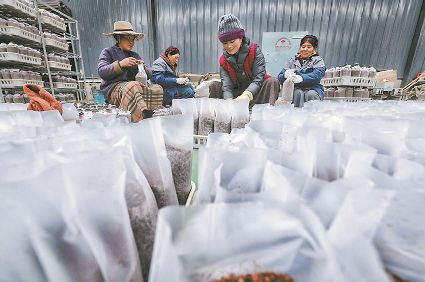 還有村民進(jìn)了產(chǎn)業(yè)園務(wù)工。帕他志瑪、扎西翁姆、白瑪、確志、斯郎卓呷都在產(chǎn)業(yè)園務(wù)工,月平均收入可達(dá)3000元以上。在八角樓鄉(xiāng),像帕他志瑪這樣在“家門口”打工、全家人掙錢的當(dāng)?shù)卮迕窦彝ゲ辉谏贁?shù)。40多位村民在產(chǎn)業(yè)園長(zhǎng)期就業(yè),100多位村民參與產(chǎn)業(yè)園的季節(jié)性就業(yè),這都帶動(dòng)了松茸村、木澤西村、維地村的貧困群眾實(shí)現(xiàn)高質(zhì)量脫貧。現(xiàn)代立體高效食用菌產(chǎn)業(yè)的建立讓當(dāng)?shù)卮迕竦谝淮螄L到了一天掙上百塊錢的甜頭。