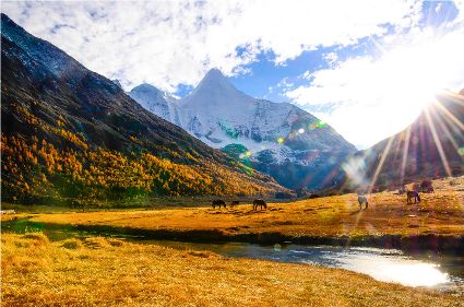 從稻城前往亞丁的路上會穿越川西風(fēng)光最美的彩色林帶,領(lǐng)略神奇的四季更替;洛絨牛場上的移動牧群點綴在一片金黃之中,猶如浮動的云朵,煞是好看。