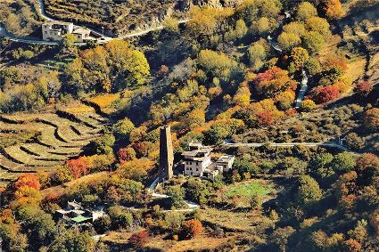 深秋初冬時(shí)節(jié),丹巴的村村寨寨呈現(xiàn)出一派多彩的畫面,仿佛是一塊打翻色彩的調(diào)色板,五彩斑斕,好似一幅美麗的童話世界。