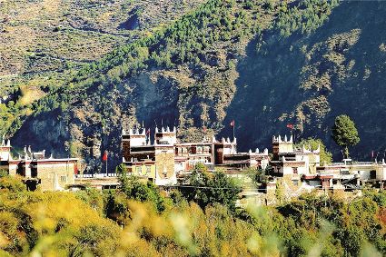 甲居藏寨依山面水,紅白相間的民居從大金河谷層層疊疊向上攀援,錯(cuò)落有致的散布在山坡上,樹葉漸次褪綠,漸染紅色,山頂是皚皚白雪,將田園牧歌式的畫卷展示在人們眼前。