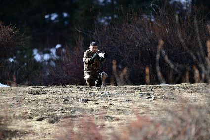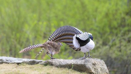 4月16日,筆者在康定市雅拉鄉(xiāng)境內(nèi),再次拍攝到國家二級保護(hù)動物白腹錦雞求偶的清晰視頻。一只色彩斑斕的雄鳥,拖著黑白相間的云狀斑紋尾羽,圍著雌鳥跳起了“圓舞曲”。整個求偶過程有十多分鐘。每年三至五月是白腹錦雞求偶期。