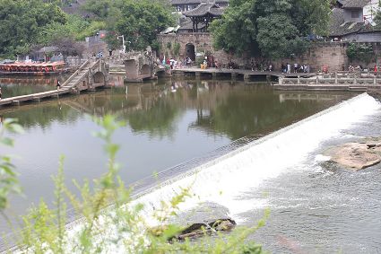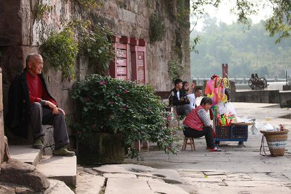 大榮橋。這座建在瀨溪河上、歷經(jīng)數(shù)百年的古石橋,一頭連著大足的地盤,一頭連著榮昌的地盤,故名??创髽s橋的最佳觀景點(diǎn)設(shè)在大榮寨對面的萬靈山腰,從那里看大榮橋和橋拱那端毗鄰的大榮寨,一種看白描連環(huán)畫中古鎮(zhèn)的感覺,就冉冉升起了。