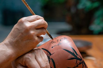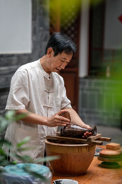 生活在云南省紅河哈尼族彝族自治州建水縣碗窯村的徐榮洪是當(dāng)?shù)匦旒腋G的第五代制陶藝人,也是非遺建水紫陶燒制技藝的傳承人。 泥料制備、拉坯造型、濕坯裝飾、雕刻填泥、高溫?zé)?、無釉磨光……要想做出精良的紫陶工藝品,每個流程都需要潛心鉆研?!爸谱骷妓嚟h(huán)環(huán)相扣,某一道工序出現(xiàn)紕漏,燒出來就是瑕疵品?!?徐榮洪拿起刻刀,對陶坯表面開始進行雕刻。 今年57歲的徐榮洪小時候就跟著長輩上山挖陶泥,多年來堅持鉆研建水紫陶的制作技藝。 徐榮洪介紹說,作為紫陶藝人,以陶為紙,根據(jù)器型將不同的文化與藝術(shù)形式注入其中,使其具有無限活力。非遺文化閃爍著人類智慧的光芒,也承載著人們心底的情思鄉(xiāng)愁。