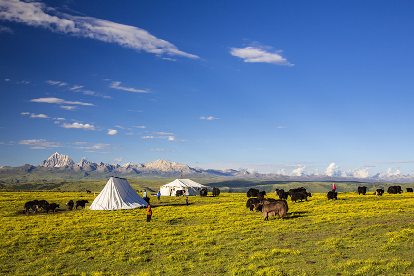 然后行走在山水之間,擁抱大自然,尋找屬于自己的“詩和遠方”。油綠的青稞、小麥,散發(fā)出濃郁的田園風味;天邊群山起伏,磅礴的氣勢瞬間感覺人在自然面前實在太渺??;帳篷點綴著開滿野花的牧場,牦牛哞鳴,一片生機,細細體會牧民“逐水草而居”的生存智慧......