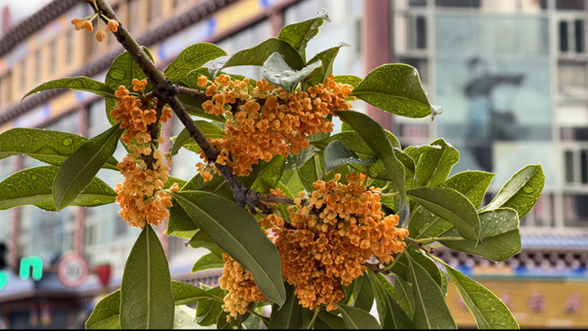 無間纏綿的秋雨后,漫步在巴塘的街道,悠悠的一股香氣沁入心扉。此時(shí),頭頂?shù)乃{(lán)天,云卷云舒,嬌小的丹桂掛在樹梢枝頭輕輕搖曳,花香詩意相融于高原江南別有意趣。