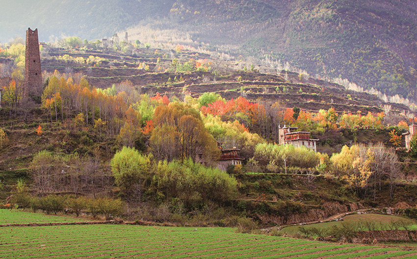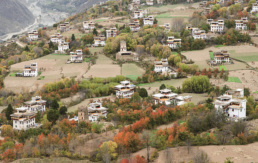 四季更迭,中路藏寨的魅力各異。秋天,正是藏寨最為絢爛的季節(jié)。造型獨(dú)特、別致的藏式民居,蜿蜒曲折的林間小道,組成了一幅美不勝收的畫卷。藏寨依山勢迤邐連綿,分布在相對高差近千米的山坡上,藏式樓房灑落在五彩斑斕的彩林中,與山谷、溪流、雪峰交相輝映,極富層次,構(gòu)成了一幅恬靜如詩的優(yōu)美畫卷。