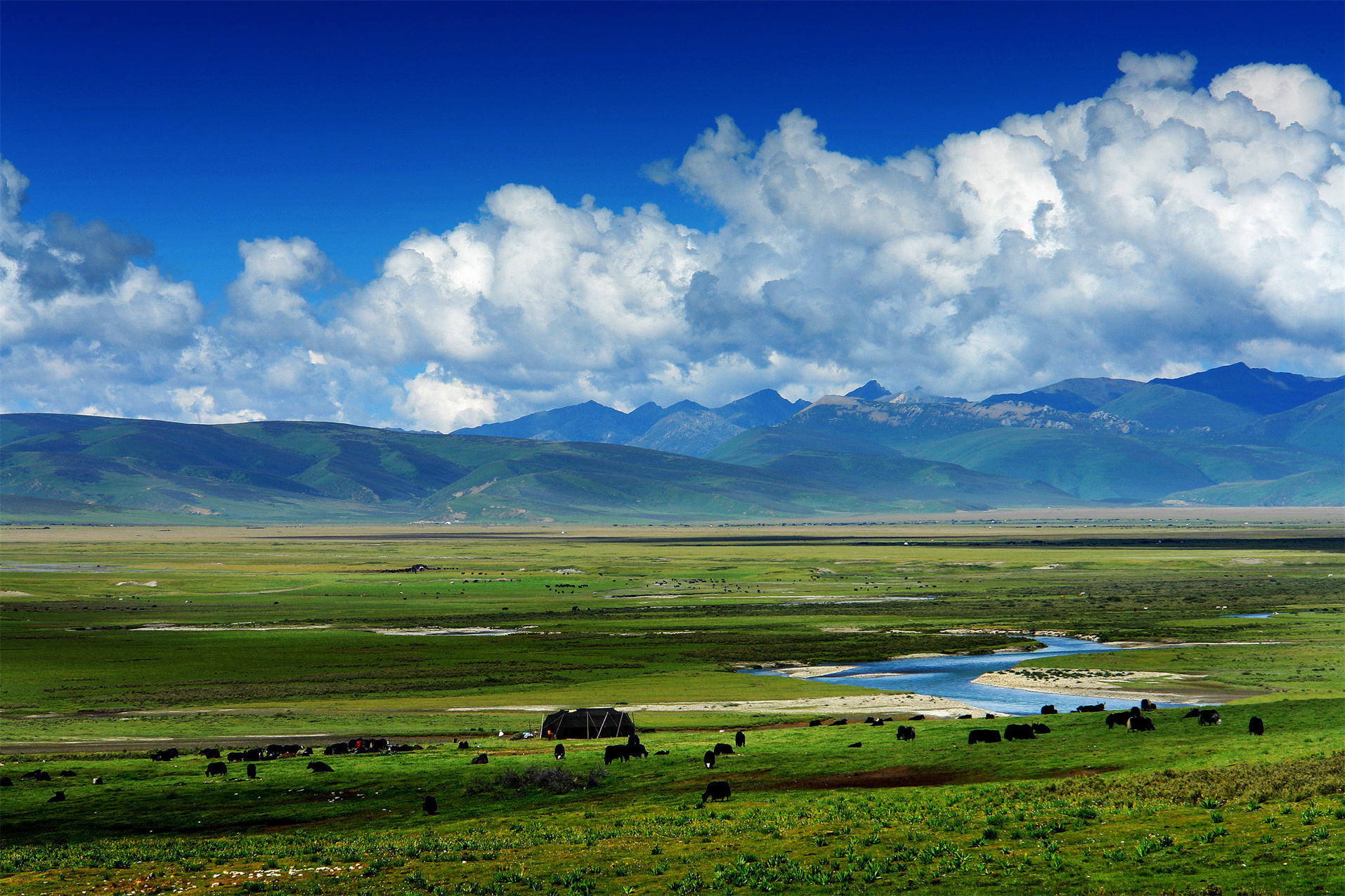 數(shù)十公里的青青草地,點(diǎn)綴著帳逢、氈房,成群的牛羊在悠閑地散步吃著青綠的草。
