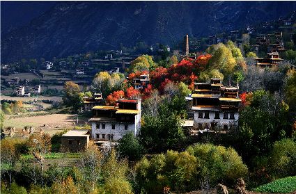 丹巴的秋似乎來得更晚一些,當(dāng)羌塘高原上的雪花從彤云密布的天空中飄灑下來,雅礱江上游滴水已成冰的時候,那秋才帶著陣陣涼意,伴隨著飄飄蕩蕩的白云,跨過雪域高原,翻過崇山峻嶺,載著五顏六色的夢想,悄悄的眷顧上這塊還郁郁蔥蔥的峽谷。就這樣,秋在不經(jīng)意間劃過峽谷兩岸,用自己特有的方式,渲染了所有的景色,漸漸瘦弱了山的肌膚。