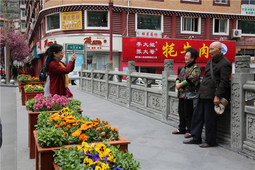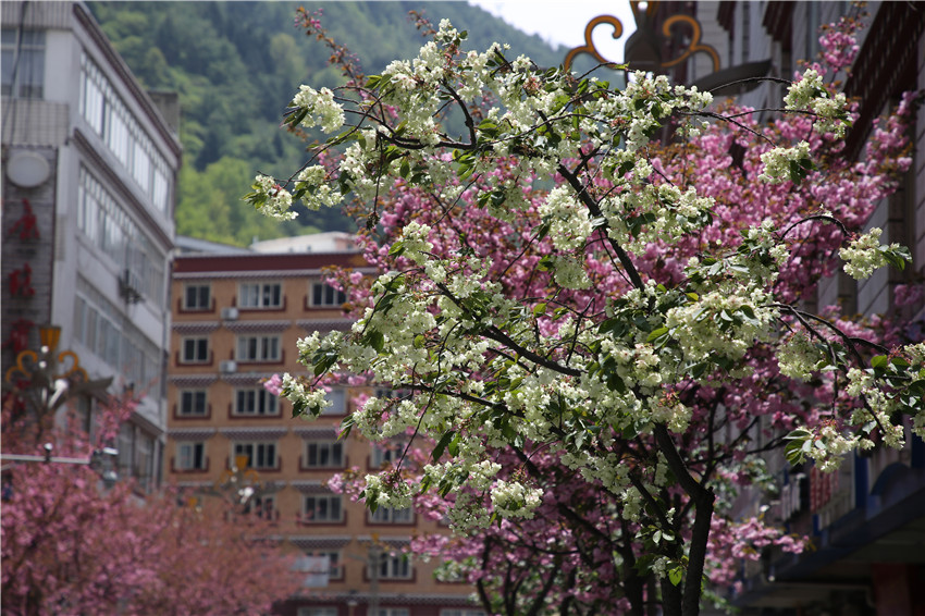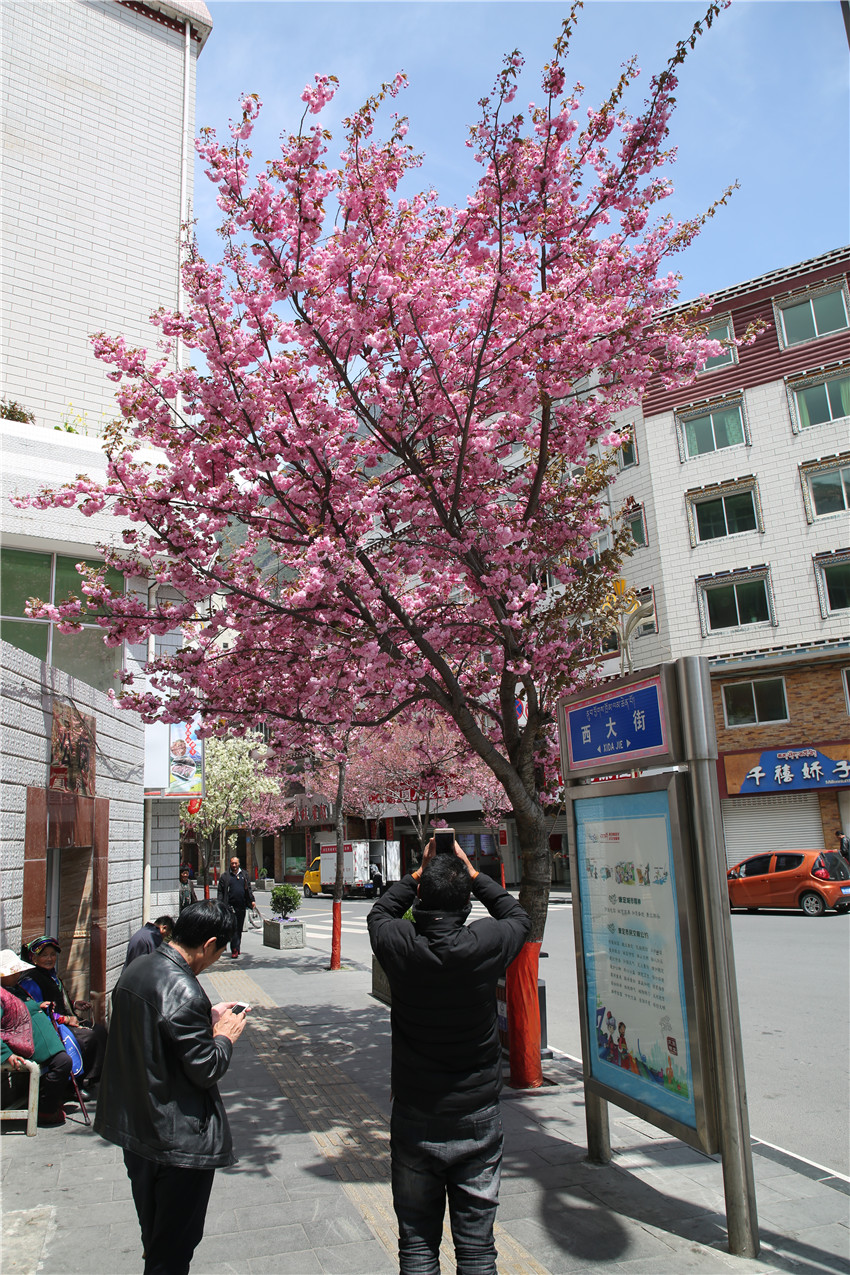 當(dāng)春天遇見(jiàn)最美的櫻花時(shí),驚艷了整個(gè)康定。櫻花與身邊人都將成為春日里的浪漫風(fēng)景。櫻花之美,美在氣勢(shì),櫻花紛飛,夢(mèng)幻唯美。每年4月中旬,康定城北門的櫻花綻放后,人們像是約好了一樣聚集到這里,共赴這一場(chǎng)甜美盛宴。這一路繁花似錦,人們穿過(guò)枝椏花正盛的櫻花林,穿過(guò)粉色海洋,徑直奔向一個(gè)浪漫的童話,一路櫻花飄散,一路粉光燦爛。櫻花絢麗繽紛、陸續(xù)綻放,若恰逢一陣春風(fēng)經(jīng)過(guò),櫻花瓣隨風(fēng)舞動(dòng),猶如紛落的雪花,空氣中浮動(dòng)著櫻花特有的淡淡香氣,令人不禁懷疑自己置身夢(mèng)境。“康定的春天來(lái)得要晚一些,綻放的櫻花,滿街的花草,折多河畔楊柳依依,康定的春天無(wú)比驚艷,醉了游人?!敝芟壬贿吪恼?,一邊感嘆,他在康定生活了40多年,20年前的康定,可以說(shuō)找不到像樣的花草樹(shù)木,進(jìn)入新時(shí)代,康定城市變美了,城市綠化走在了前面,城市的美譽(yù)度舒適度不斷提升??刀ㄖ?,春色滿園,姹紫嫣紅,風(fēng)光旖旎。