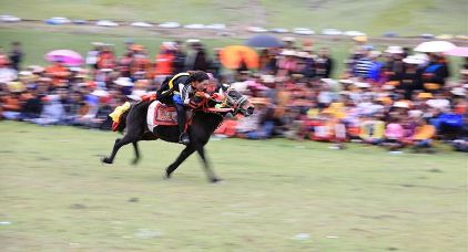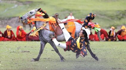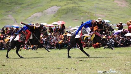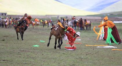 7月23日,四川甘孜藏族自治州理塘縣村戈鄉(xiāng)賽馬活動開始,牧民們在馬背上一顯身手。每年藏歷六月,當(dāng)草原上格?;ㄊ㈤_的時候,四川省理塘縣24個鄉(xiāng)(鎮(zhèn))就會按照習(xí)俗舉辦隆重的賽馬會來拜祭神山,慶祝豐收。迄今有400多年歷史的賽馬分為耐力賽、小走賽、馬術(shù)賽等,其中最為精彩的是馬術(shù)賽:馬肚藏身、馬背倒立、飛騎射擊、拾哈達(dá)等,驚險(xiǎn)刺激。2008年6月,此項(xiàng)活動被列入四川省級非物質(zhì)文化遺產(chǎn)保護(hù)項(xiàng)目。(朱虹 葉強(qiáng)平)