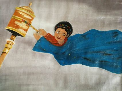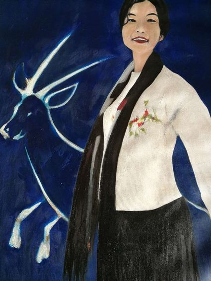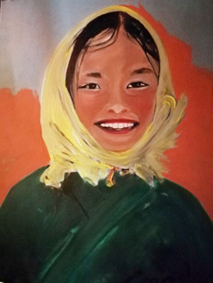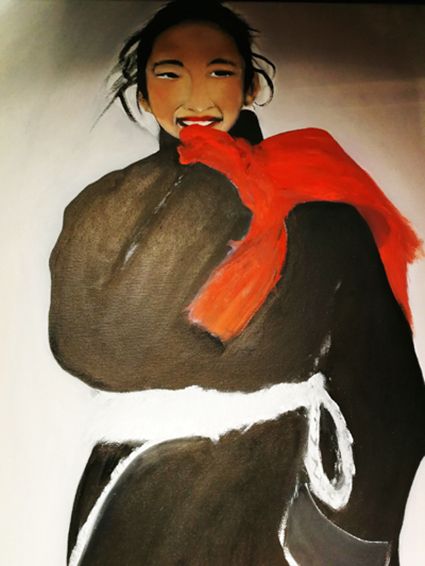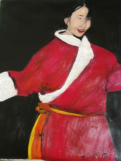 畫畫三年多了。十三歲寫詩;到了高原后,方開始創(chuàng)作長(zhǎng)篇小說。在上海,我做過畫廊。但要說斗膽動(dòng)筆畫幅肖像。我是在白度母唐卡前燃了三炷香的。包括在咖啡店現(xiàn)場(chǎng)作畫。到京城繼而國外辦畫展,我認(rèn)為都是因了我把畫布當(dāng)成了詩稿的緣故。于是,大家喜歡我這種野路子,天馬行空,可又不舍方圓的創(chuàng)作手法。接下來,歐洲、東京還會(huì)有我的系列展覽。