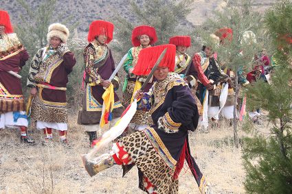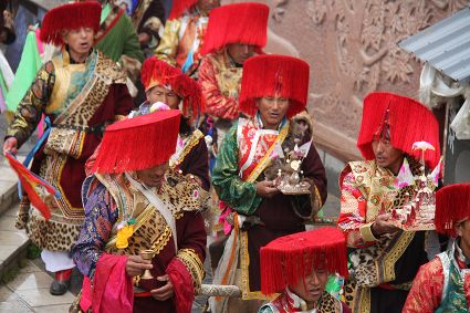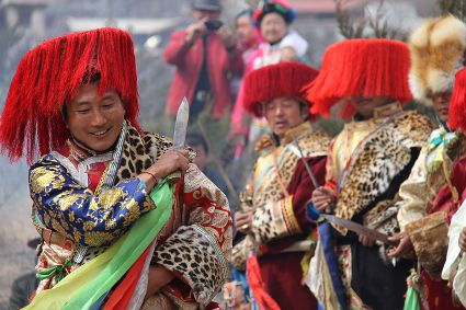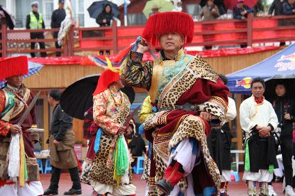 除了歌舞文化,德欽還是民俗文化最大的平臺(tái),神山祭祀是村村寨寨必不可少的活動(dòng),在德欽,藏民對山水自然賦予了靈性,認(rèn)為自然也是和人一樣有著生命和靈性,尊重自然演繹出神山祭祀活動(dòng)豐富多彩?!暗顿潯?藏語稱“百諧”。在德欽農(nóng)村,刀贊是祭祀活動(dòng)的重頭戲,這一天,不亞于一個(gè)盛大的服飾表演。相傳“百諧”是古時(shí)村民為消除戰(zhàn)亂,祈福平安的一項(xiàng)傳統(tǒng)祭祀活動(dòng),延續(xù)至今已經(jīng)成為一項(xiàng)傳統(tǒng)的民俗活動(dòng)。“百諧”既是祭祀活動(dòng)的一個(gè)儀式,也是一個(gè)獨(dú)立的傳統(tǒng)民俗活動(dòng),村里每戶一男丁在這一天必須參加“百諧”。“蘇夏”是村里男人戴的最為隆重的帽子,他不同于金邊帽和狐皮帽。長刀是“刀贊”的道具, “吉祥的日子里,我們一敬天地,賜給我們帶來幸福的生活;再敬尊敬的共產(chǎn)黨,為我們帶來平安吉祥;三敬慈祥的雙親,教會(huì)我們?nèi)绾巫鲆粋€(gè)好人……”朗朗上口的說詞伴著閃閃的刀光起舞,頗具康巴壯士的英武陽剛。