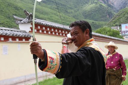 射箭也是德欽以及周邊些村落的重要民俗活動(dòng)之一,村里的男人們盛裝出場,在射箭場彎弓搭箭,從7、8歲小孩到50多歲的老人都要參加射箭,甭管你射得中靶子與否,笑聲里充滿了和諧和喜慶。德欽縣的江坡村,在每年桃花盛開的季節(jié),都要開展盛大的射箭節(jié),全縣的射箭愛好者都前來一顯身手,康巴漢子們不僅射得一手好箭,還得會(huì)拉弦子,悠揚(yáng)的弦子聲可以給射手們加不少分,活動(dòng)的初衷就是要求藏族男人必須能文能武。弦子聲聲,唱出了藏家百姓美好的生活,村里的女人戴上了各種金銀首飾,男人們手拉弦子,盡情歡暢的唱著、跳著,村里的老人們是忠實(shí)的觀眾,看著大家在舞場里的步子,他們也跟著笑得合不攏嘴,有些年輕人還不時(shí)跑出舞場到場邊的老人們面前請教弦子的唱詞,老人們總是不厭其煩的傾囊相授,因?yàn)樗麄冊?jīng)也是弦子舞場的“明星”。