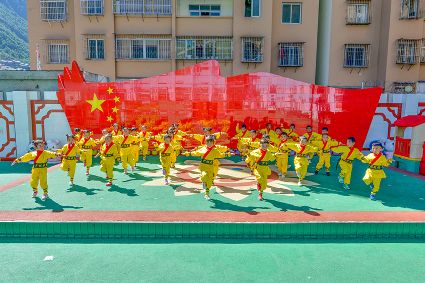 活動形式多樣,有稚嫩的獨唱,有歡快的舞蹈,有英姿颯爽的少林功夫......活動最后,由園長引領(lǐng)全體師生合唱的《我和我的祖國》,每個孩子手中揮動的一面小紅旗匯成了紅色的海洋,我用相機(jī)捕捉他們的表情時,看見幾位老師的眼睛閃爍著晶瑩......