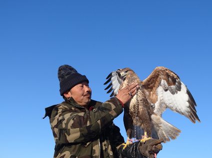 “小一點(diǎn)的鷹好訓(xùn),訓(xùn)老一點(diǎn)的叫熬鷹。 開(kāi)始熬鷹前,一次性喂飽鷹,七天七夜不吃不喝不睡覺(jué),待七天時(shí)到,放鷹于空,手中拿肉,用我們倆特殊的交流方式指揮它,這時(shí)它會(huì)落我的手臂上。但是,這一只始終沒(méi)服過(guò)我。訓(xùn)出來(lái)一只大約半月左右?!庇?xùn)鷹人說(shuō)。