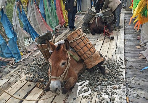 這是318和317國道都不通過的甘孜州白玉縣,從白玉縣城通往建設鄉(xiāng)德沙村的路是一條木制棧橋,2014年5月4日的中午,兩頭騾子在300斤石料的重壓下踩斷了中間的橋板,兩條前腿從踩碎的木板處懸著,騾子發(fā)出粗壯的喘息聲,無法掙扎,不能動彈。棧橋上有路過的藏民,手中旋轉著轉經筒,他口中念念有詞:騾子啊,你還沒有得到解脫。一群來自外地的游客都很驚詫。 騾子運輸隊的王玉海,在過往行人和同行的騾隊鄉(xiāng)親的幫助下,先卸下騾子身上背負的碎石,然后手伸到騾子前腿根處,用力抬起騾子的前身。在查看騾子沒有受傷后,王玉海把這兩只騾子牽到騾隊最后面,然后,引著另外5只負重的騾子,從橋靠左邊的雙層木板橋面上通過,騾子隊受到驚嚇,不愿意上橋,王玉海安撫了一會兒騾子隊后,在同伴的協(xié)作下,前面牽引,后面驅趕,終于,王玉海的7只騾子過橋,其他8個同伴的50多頭負重的騾子也一一通過。