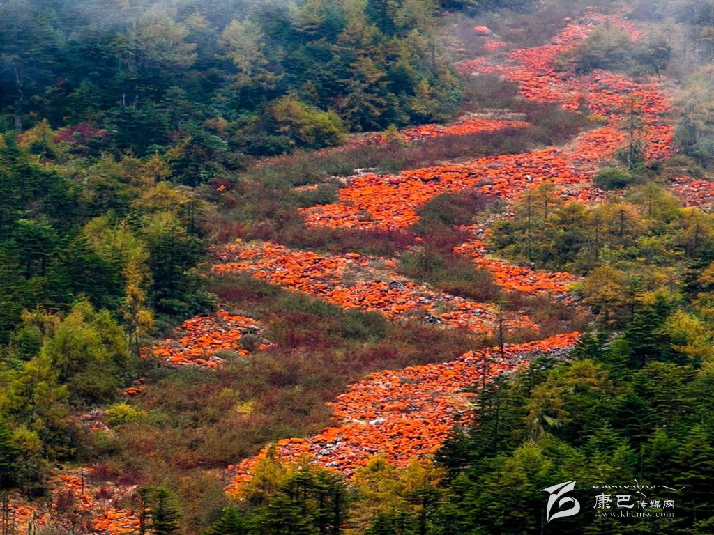路段兩邊就是貢嘎雪峰所在的大雪山,貢嘎雪峰是整個(gè)橫斷山區(qū),也是青藏高原東部最高的山峰,海拔高達(dá)7556米。圍繞著貢嘎雪峰有許多海拔五六千米的雪峰,這條路就要從這些雪峰中的一處低矮處通過。我看到一條條冰川從雪峰下流淌下來,冰川流動(dòng)的速度太快,還來不及融化,就沖進(jìn)了郁郁蔥蔥的森林,冰川末端融水形成的河流蜿蜒地流淌在針葉林中。河谷很寬闊,這是洪水和泥石流暴發(fā)時(shí)沖出來的。然而奇怪的是本來應(yīng)該是灰白色的卵石鋪就的河谷,現(xiàn)在卻是鮮紅的顏色。紅色的河谷從雪山一直鋪陳下來,好像是一個(gè)油漆匠把他的油漆桶弄翻了,紅色的油漆流淌出來,又好像行為藝術(shù)家的大制作。