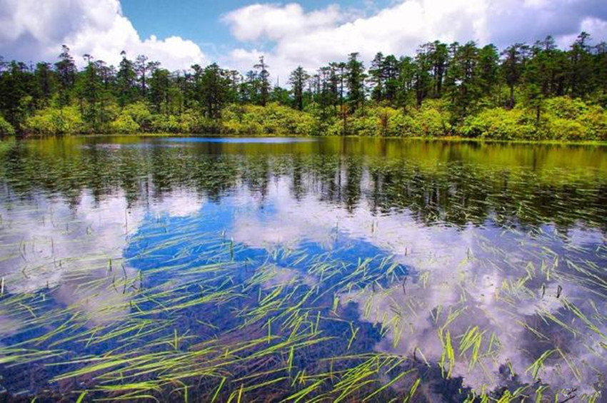 繼續(xù)前行,下一站既是木格措。木格措漢名:野人海,水源來(lái)自于身后女?huà)z雪山的積雪融水,水質(zhì)清冽,能見(jiàn)度極高,湖四周群山環(huán)抱,紅海、黑海、白海等幾十個(gè)小海子圍繞在周?chē)?,如眾星拱月般。木格措風(fēng)光秀美,“臥虎觀月”、“雙霧墜海”等景觀最為獨(dú)特。