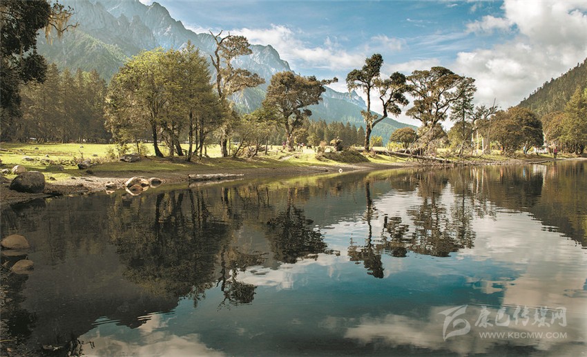 “江”與“湖”,靜臥于原始森林與草甸花海的之間,河溪清澈,湖水湛藍(lán),真如秘密花園,人間仙境。湖畔最美的是盤根錯(cuò)節(jié)的老柏樹,枝條彎曲如蒼龍,或立于湖畔,或臥于湖中,滿湖樹影、花影隨風(fēng)搖曳。