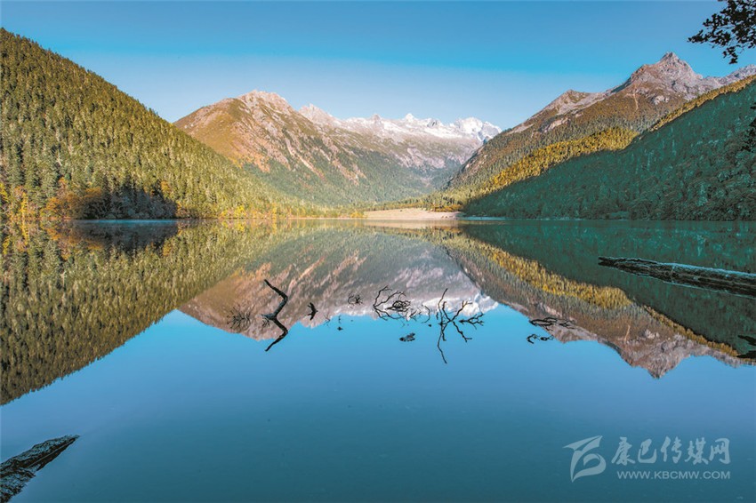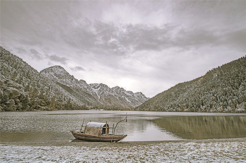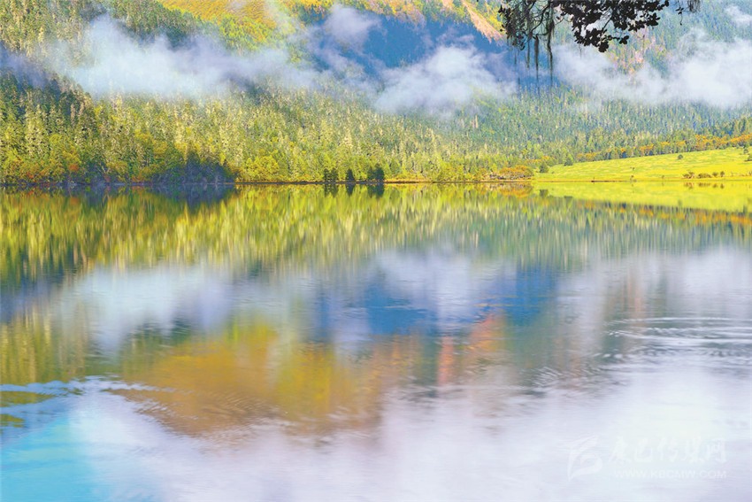 置身于雪山、湖色與草色,陽(yáng)光精確地照在一棵金色的樹上,樹的光亮奪目與遠(yuǎn)處云霧繚繞的暗山形成反差,如夢(mèng)如醉。