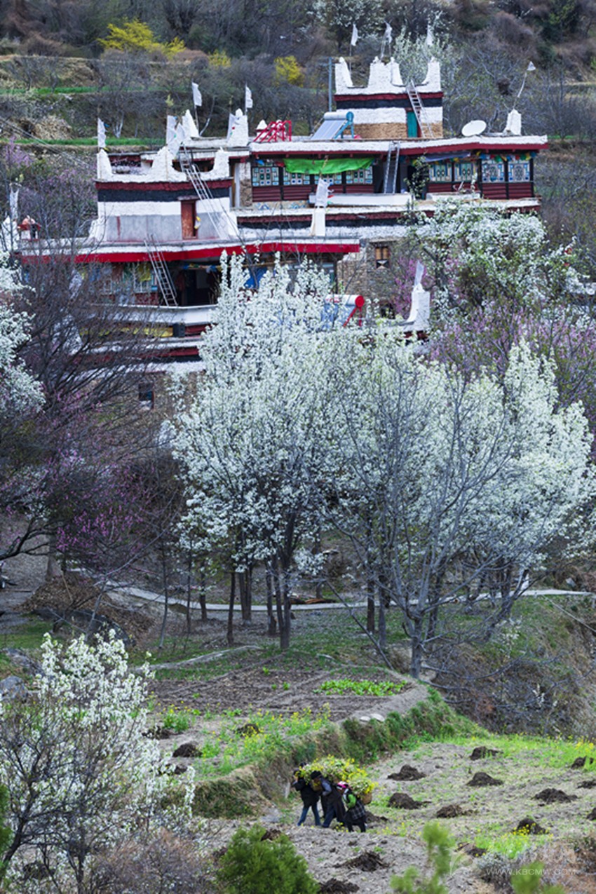 春天的丹巴,碧葉輕蕊,梨花堆雪。房前屋后,山腰山脊皆是滿眼的淡白梨花瓣。暖暖的微風(fēng)吹過,滿樹的花瓣帶著泥土與花香撲鼻而來。藏寨、碉樓、繁花,美不勝收。