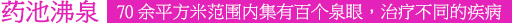 稱為藥泉的沸泉群水溫高達(dá)90℃,含有多種對(duì)人體有益的元素,不同的泉眼(如明目泉、健胃泉、洗腳泉等),分別對(duì)治療眼疾、胃病、風(fēng)濕等病癥具有不同的療效。