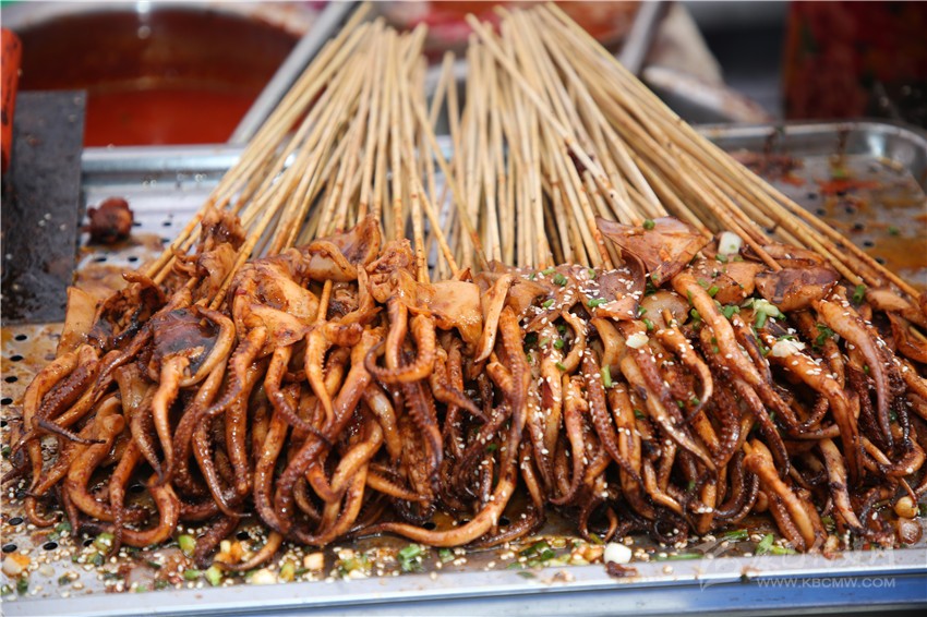 作為一個四川人,對于麻辣味的食物毫無抵抗力,在康定后街林立的商鋪中,記者一眼就相中了“深海魷魚花”這家店??粗褐t油的魷魚花靜靜地躺在紅椒和芹菜間,記者咽了咽口水,向老板買了一份兒?!罢媸羌兗兊拇ㄎ秲簺]錯了,又麻又辣的?!庇浾邔习逭f。老板回答到:“魷魚花最講究的就是刀法了,要切得好看。雖然在顧客看來都差不多樣子,但是我每次都要經(jīng)過細細斟酌再一刀一刀的切,爭取多弄幾種樣式,現(xiàn)在我的常客們也會細細地考究我切的魷魚花了。以前我只賣烤魷魚,只是在家里偶爾會給我兒子做魷魚花,后來看我兒子喜歡吃,才開始慢慢地賣魷魚花,沒想到還是很受歡迎。這次美食節(jié),我發(fā)現(xiàn)沒有人做魷魚花,所以我就帶著我兒子喜歡的魷魚花來參加這次美食節(jié)了?!崩习逍χ浾哒f。