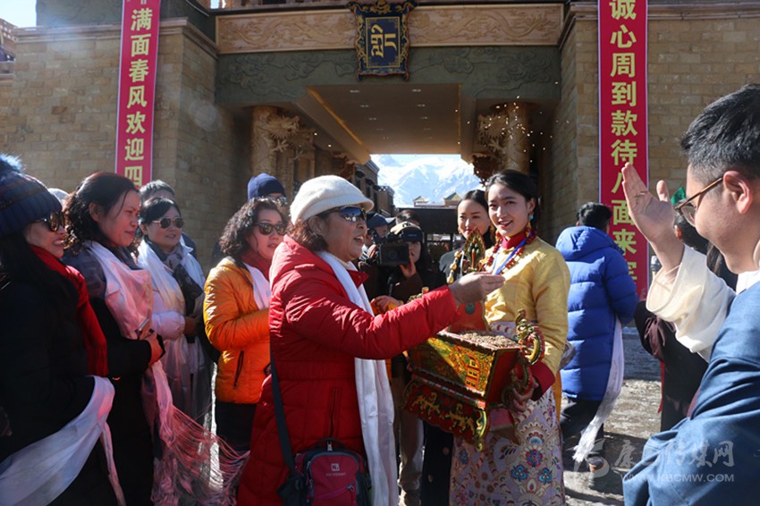 游客們剛到格薩爾王城門口就滿滿地感受到了當?shù)厝嗣竦臒崆?,“嶺國四位大將”和“格薩爾王王妃”盛裝在城門口擊鼓迎接遠道而來的客人們,為他們獻哈達、敬青稞酒,帶領(lǐng)大家轉(zhuǎn)煨桑爐祈福,在切瑪盒前體驗灑青稞和糌粑祈福儀式。隨后,游客們在王城體驗了喝圣水、祈福、騎馬、射箭等項目。王城內(nèi)宏偉的建筑,獨特的文化魅力,優(yōu)質(zhì)的服務(wù)質(zhì)量,讓遠道而來的游客贊不絕口。