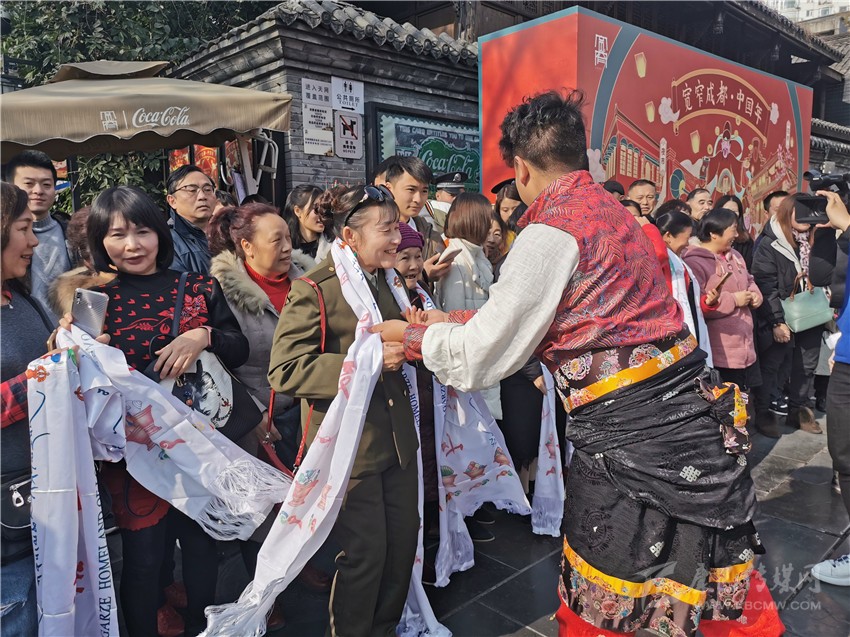 快閃還未開始,20名身著少數(shù)民族服裝的藏族姑娘小伙,便成為了一道最獨特、亮麗的風景線。隨后,他們給游客們帶來了獨具甘孜特色的歌舞《康定情歌》《甘孜踢踏》,悠揚的歌聲、奔放的舞步,讓圣潔甘孜大美天成的獨特風韻完美展顯,吸引了春熙路如潮的人群,被歌舞魅力感染,不少市民隨著他們一起唱跳了起來。而此時的成都寬窄巷子里,也正在演繹著一場震撼的“快閃”,四名穿著格薩爾王服飾的大將,身披鎧甲、手持刀劍,格外威武帥氣,市民和游客紛紛拿出手機拍照留念?!翱扉W”結束后,熱情的甘孜兒女為周邊的觀眾獻上潔白的哈達,向他們致以美好的祝福,并誠摯歡迎他們到甘孜旅游。