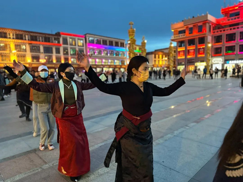 本網訊 每到傍晚時分,色達的金馬廣場上都會準時響起起歡快的鍋莊曲。 舞者們雙手隨音樂自然張開,邁著輕快的步伐,踢腿、揚手、轉圈。游客們有的拿起手機拍照留念,有的則加入鍋莊舞的隊列。