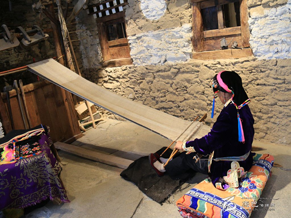 穿過古樸的大門,步入館中,映入眼簾的是古老的民間紡織技藝。一位藏族老阿媽端坐在古董般的織布機前,聚精會神地編織布匹,見到游人微笑回應(yīng),并未停下她手上的工作。年逾60的擁天秀,從十幾歲便學習織布,此間從未間斷。隨著紡織機逐漸被淘汰,擁天秀已成為傳承這門古老技藝的“活化石”。非遺展示館開館時,擁天秀主動表示,愿在此地免費為游客展示丹巴紡織技藝。 “我喜歡丹巴刺繡和紡織工藝,平時在家里也會做,現(xiàn)在眼睛不很好,所以刺繡沒有辦法做了。游客們很喜歡在這里看我織布,他們有什么問題,我都會給他們講解。”古老的嘉絨紡織技術(shù),通過擁天秀的雙手,漸漸被人們熟知,無數(shù)張游人與她的合影也被傳至網(wǎng)絡(luò)。經(jīng)她現(xiàn)場紡織,價值600元一匹的純手工布銷量也節(jié)節(jié)攀升,擁天秀研習多年的手工活在展示館中終于有了“用武之地”。