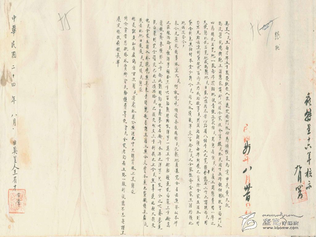 當(dāng)年國(guó)民黨一支中央軍在康定南郊修建了飛機(jī)場(chǎng),其地址就在如今煙草公司到軍分區(qū)那一帶。這是個(gè)從來(lái)沒(méi)有發(fā)揮過(guò)作用的飛機(jī)場(chǎng),過(guò)去一直以為那地方完全是荒蕪的河灘地,通過(guò)這份由一位名叫王有才的菜農(nóng)在1935年呈給縣長(zhǎng)的“懇狀”,可以看出那地方其實(shí)也有可以種植出小菜的熟地。