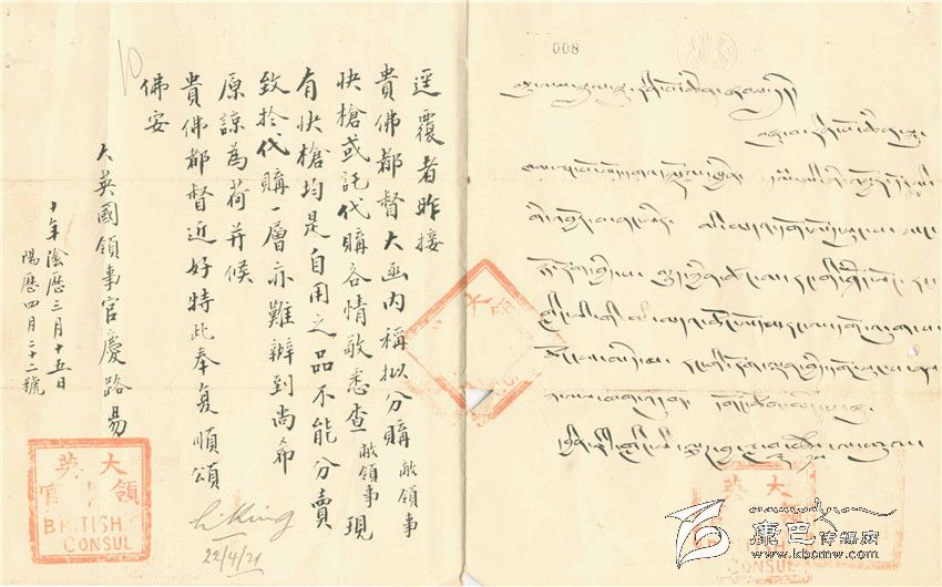 可以肯定的是,這就是給某位活佛的復信,除了稱呼佛都督(這是在當時對活佛的通行的敬稱)可以看出外,還有藏文可以佐證。這張紙片上寫道:昨接貴佛都督大函,內稱,擬分購敝領事館快槍或托代購各情敬悉。查敝領事現有快槍均是自用之品,不能分賣。致于代購一層,亦難辦到,尚希原諒為荷,并候貴佛都督近好,特此奉復,順頌佛安。署名是大英國領事館官慶路易,日期為十年陰歷三月十五日,陽歷四月二十二日。在公章下面注有公元1922年4月22日。