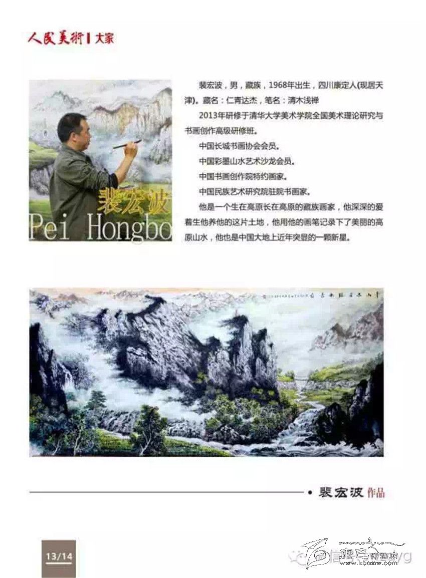 《人民美術(shù)》是中國最具權(quán)威的美術(shù)雜志、國家核心美術(shù)雜志和美術(shù)界最高學(xué)術(shù)雜志,由《人民日報》社主管。雜志社對裴宏波及其作品給予了高度評價,認為藏族畫家裴宏波的作品極具生命力,在中國美術(shù)史上又有了新的突破,富有民族性、地域性、創(chuàng)造性、歷史性,最終決定列選為中國大家。雜志中裴宏波排在劉大為、曹雕、劉文西等之后。