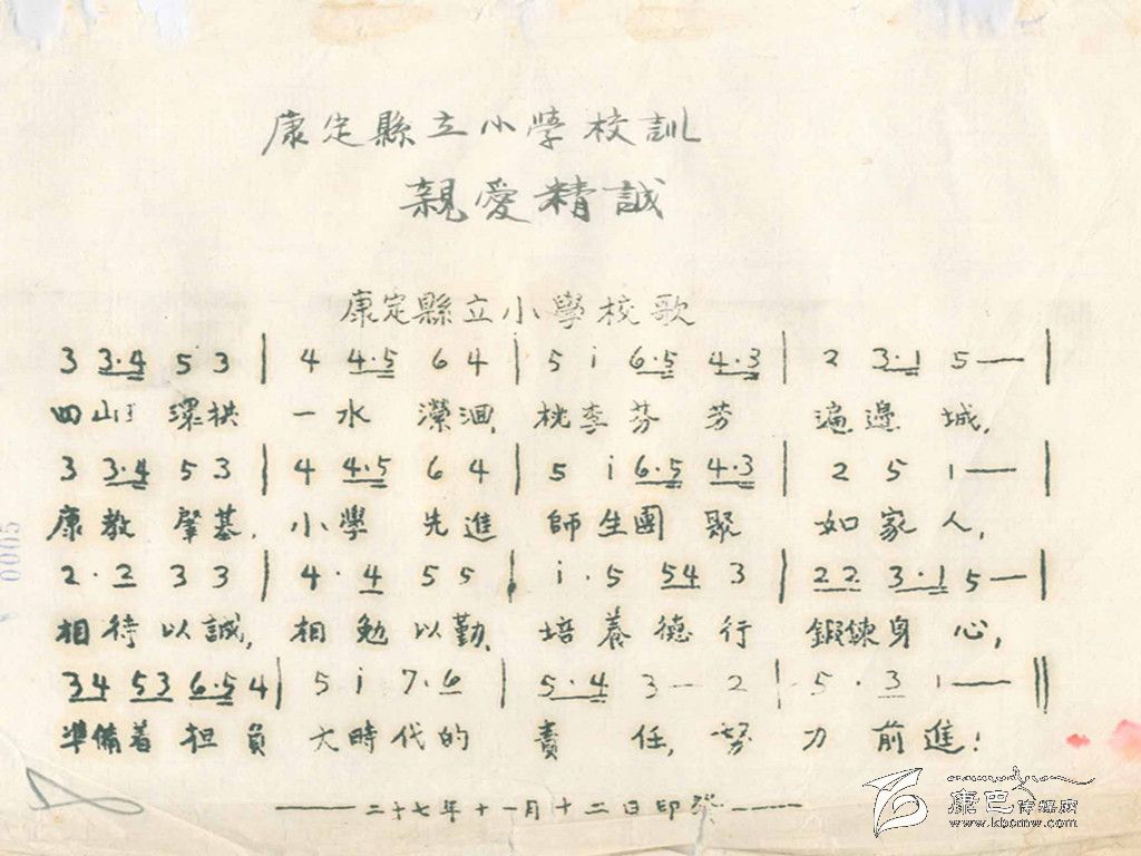 在眾多的民國教育檔案中,關(guān)于西康省各地學校的學生花名冊、學生成績表、學校經(jīng)費運用情況,以及教職工領(lǐng)取工薪的領(lǐng)條和表格等等有相當大的一部分。難得的是,在這些檔案中竟然出現(xiàn)了兩份“歌譜”。細看卻不只是“歌譜”,而是兩所小學把自己學校的“校訓”寫成的“校歌”。其中,一份是康定縣立小學依據(jù)校訓“親愛精誠”寫成的校歌,另一份是日地短期小學依據(jù)校訓“智仁勇”寫成的校歌。通過這兩份“校歌”,可以看到當時小學教育已經(jīng)較為正軌,還開設有音樂課。“校歌”的內(nèi)容積極向上,充盈現(xiàn)在所說的“正能量”,鼓勵學生努力學習,成為有擔當?shù)娜恕?/div>