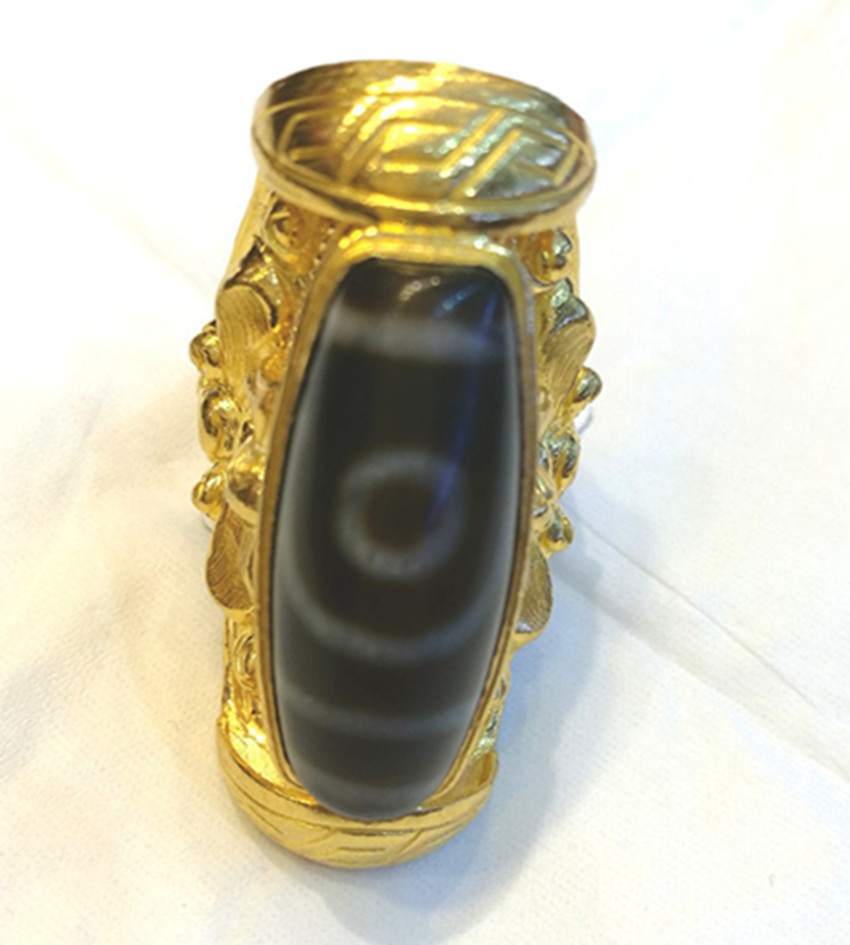 天珠,一種神秘而珍貴寶珠,不僅具有裝飾搭配的作用,更寓意著平安、好運。藏族人認為能夠供養(yǎng)一顆老天珠既是有了福報,并相信能夠獲得意想不到的吉祥和圓滿。珍貴的天珠鑲嵌在做工精細的黃金花紋里,不僅是對時尚潮流的追隨,更是虔誠信仰的一種體現(xiàn)。