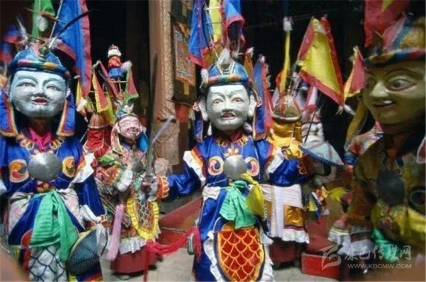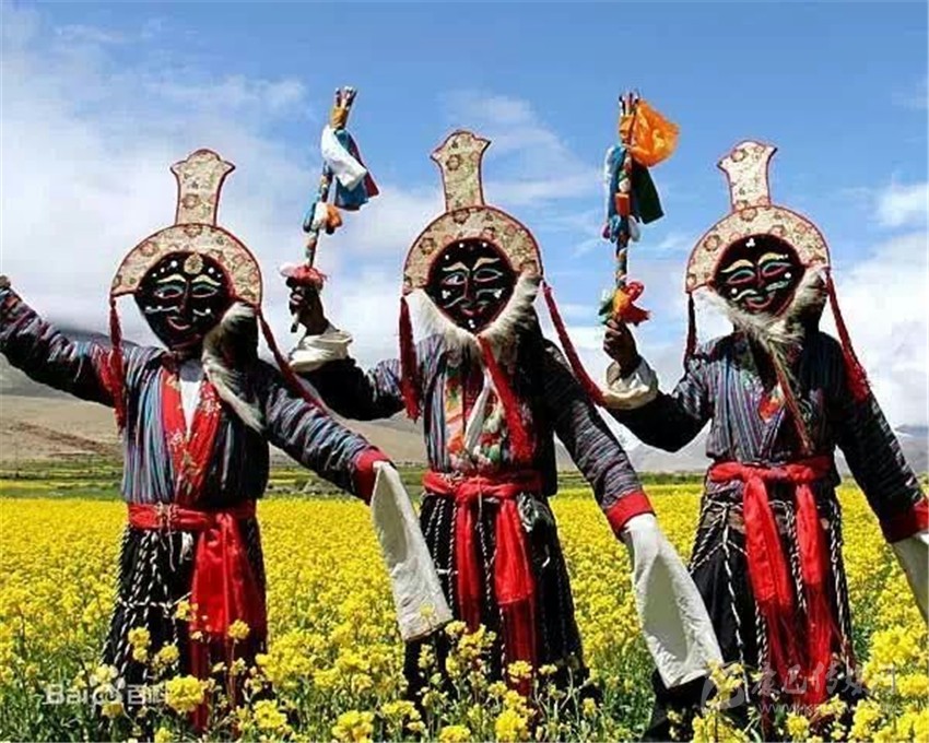 第三部分,被稱為“扎西學(xué)”。頭戴白羊皮面具,面部呈黃色的演員們是吉祥老人的化身。他們雖然老態(tài)龍鐘,但動(dòng)作卻輕盈無比。其裝束除了腰間纏繞的“子體”未掛五色彩綢外,與“溫巴”別無二致。他們在歡樂的舞動(dòng),向眾人賜福吉祥。