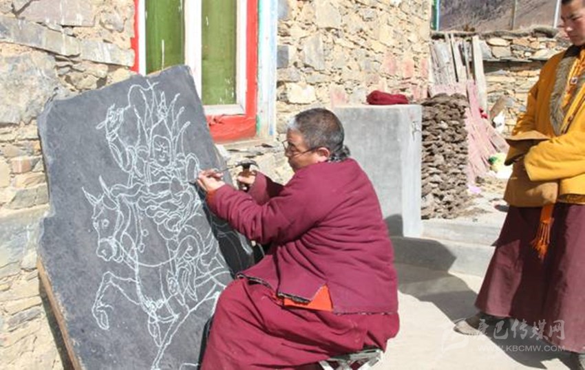 道孚縣東部的龍燈壩曾是格薩爾王征戰(zhàn)過的地方,這里以“格薩爾通”為核心的格薩爾文化世代流傳、積淀深厚,且富有質(zhì)地堅(jiān)硬、品相良好的天然頁巖。在歲月的長河中,龍燈人把傳統(tǒng)繪畫、歷史傳說和石刻工藝緊密融合,創(chuàng)造了獨(dú)具特色的龍燈石刻,填補(bǔ)了格薩爾文化在藏族石刻中的空白。千百年來,龍燈人像傳承基因一樣世代傳承著這門“專屬”工藝。