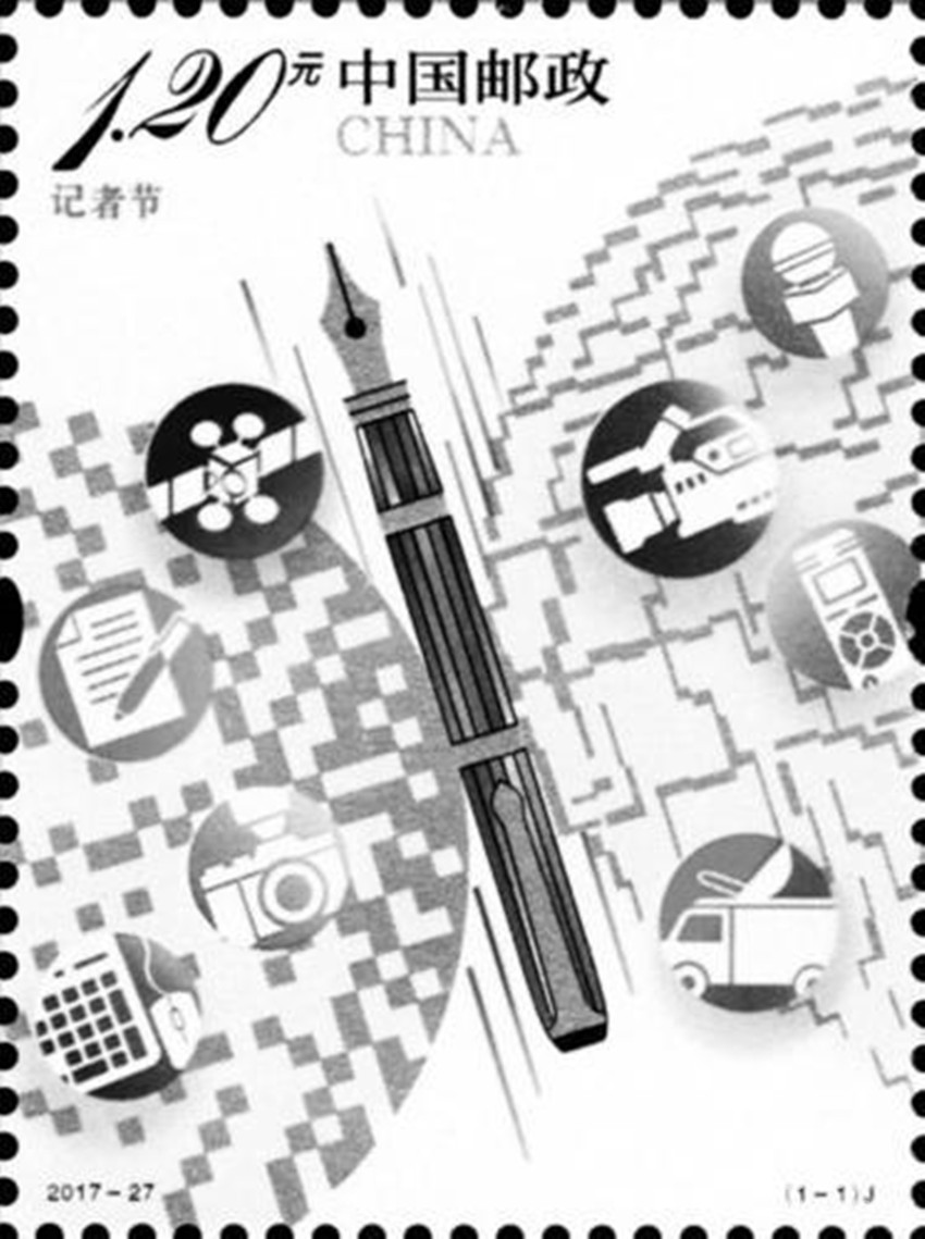 為紀(jì)念第18個(gè)記者節(jié)。中國郵政定于2017年11月8日發(fā)行《記者節(jié)》紀(jì)念郵票一套1枚。郵票圖案采用了具有現(xiàn)代感的構(gòu)成手法及色彩表達(dá)方式。畫面中的鋼筆象征了記者秉持弘揚(yáng)民族精神、維護(hù)國家利益和社會責(zé)任的專業(yè)精神和自信風(fēng)范。兩側(cè)的線條及方點(diǎn)構(gòu)成的兩個(gè)圓形圖案分別隱喻地球和現(xiàn)代網(wǎng)絡(luò)體系,表示在新媒體時(shí)代,新聞傳播媒介所呈現(xiàn)出的多元化、全球化的發(fā)展態(tài)勢。畫面中麥克風(fēng)、攝像機(jī)、錄音筆等形式各異的采編設(shè)備圖標(biāo),結(jié)合衛(wèi)星及地面發(fā)射站等元素,突出了當(dāng)代記者巨大的社會影響力。同時(shí),鋼筆和兩側(cè)的圓形圖案共同組成了一只振翅飛翔的蝴蝶形象,喻意了記者追求至善至美,在探訪報(bào)道中擔(dān)負(fù)著傳播先進(jìn)文化,引領(lǐng)和維護(hù)和諧社會,推動人類文明的崇高使命和社會責(zé)任。