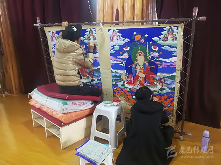 今年初秋,在爐霍縣郎卡杰唐卡演展中心門外場(chǎng)地上,三位學(xué)生正在打磨用牛膠和礦物粉浸潤(rùn)后晾干的畫布,他們將畫布平鋪在木板上,用倒扣的瓷碗一遍遍仔細(xì)地磨著。這是繪制唐卡的最初階段,也是爐霍縣唐卡協(xié)會(huì)專門為廣東媒體甘孜文化行記者安排的觀摩節(jié)目,讓大家迅即有零距離接觸唐卡的感覺。爐霍縣文化館館長(zhǎng)、郎卡杰唐卡繪畫藝術(shù)協(xié)會(huì)會(huì)長(zhǎng)雍珠洛吾由此開始,一步步帶我們走進(jìn)唐卡制作和郎卡杰唐卡藝術(shù)的世界。