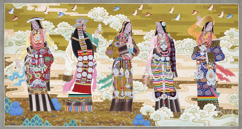 青藏高原有著曠遠(yuǎn)弘大的人文地理,有著神秘久遠(yuǎn)的宗教文化傳承,正是這蒼茫大地孕育了藏族人;正是這片極度追求審美體驗(yàn)并把生活高度藝術(shù)化的疆域,滋養(yǎng)了西藏藝術(shù)。從早期的巖畫、旗幡畫、唐卡、壁畫,再到當(dāng)代的丹青重彩,無不生發(fā)于這片神奇高原,皆是中華民族文化寶庫中燦爛的牟尼寶珠。唐卡繪畫肇啟于松贊干布隆興之時(shí),向南學(xué)習(xí)印度、尼泊爾布畫,往西受到犍陀羅藝術(shù)浸潤,向東融合唐、宋、明、清之審美,再集藏地宗教文化、民族審美熔為一爐,鑄就一千三百年唐卡繪畫之法脈。它不僅是獨(dú)具魅力的藏文化之血脈源流,更是各民族文化交融、和諧互生的典范,對(duì)世界藝術(shù)有著深遠(yuǎn)的影響。