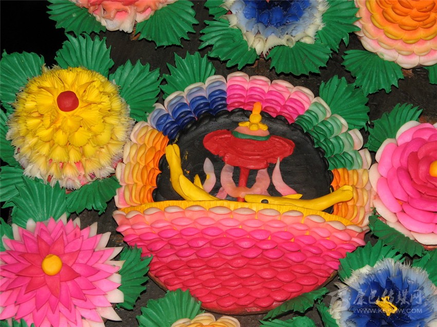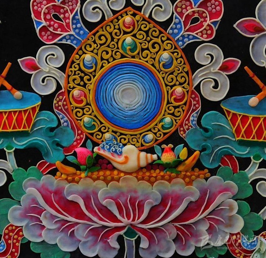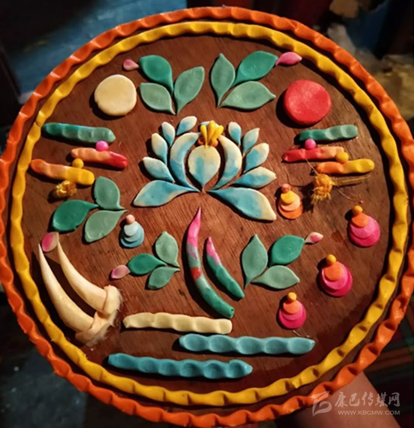 有傳說(shuō)稱641年文成公主進(jìn)藏,帶去一尊釋迦牟尼12歲等身像并將其供奉于拉薩的大昭寺,當(dāng)?shù)厝罕娪盟钟妥龀苫ü┇I(xiàn)于佛前,以示崇敬之心,后各藏傳佛教寺院相繼使用,視為禮佛珍品,獻(xiàn)酥油花遂成為正月祈愿大法會(huì)的重要內(nèi)容。在發(fā)展過(guò)程中,酥油花的塑造方式、花色品種、內(nèi)容題材和工藝技巧都不斷發(fā)生著變化。