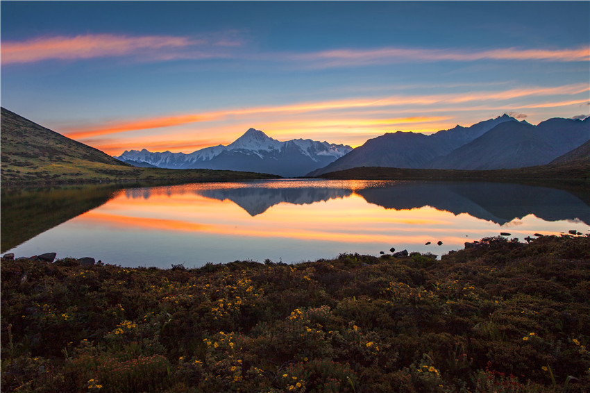 八月的康定本就二十多度,到山上溫度更低一些,加上這里的溪水不比別處的溪流,是雪山融化的水,因此,格外的冰涼。終于到了五色海的邊兒上,整個(gè)海子在眼前呈現(xiàn)。此時(shí)的五色海對(duì)于我們來說,可能不單單是個(gè)高山湖泊而已了,在我們抵達(dá)五色海之際太陽露出了笑臉,一切都是剛剛好。中午十分撤離五色?;氐叫∧疚?,吃過午飯開始下山。