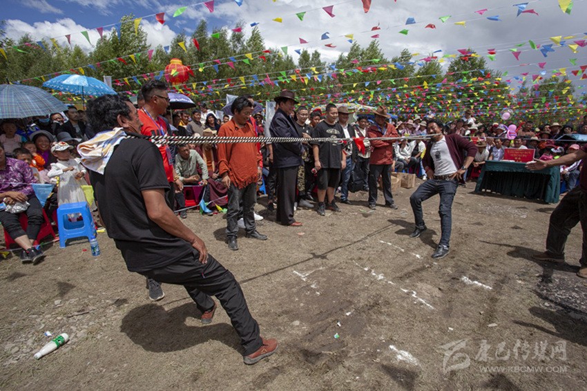 除以上活動(dòng),滾桶接力、俯撐馬鞍吃葡萄、穿藏裝揉糌粑、套牛角等趣味比賽無不展示民族體育的獨(dú)特風(fēng)格?!斑@種拔河還是第一次見,很有意思。”其中,“格吞”比賽(把帶子套在脖子上拔河)深得觀眾喜愛。