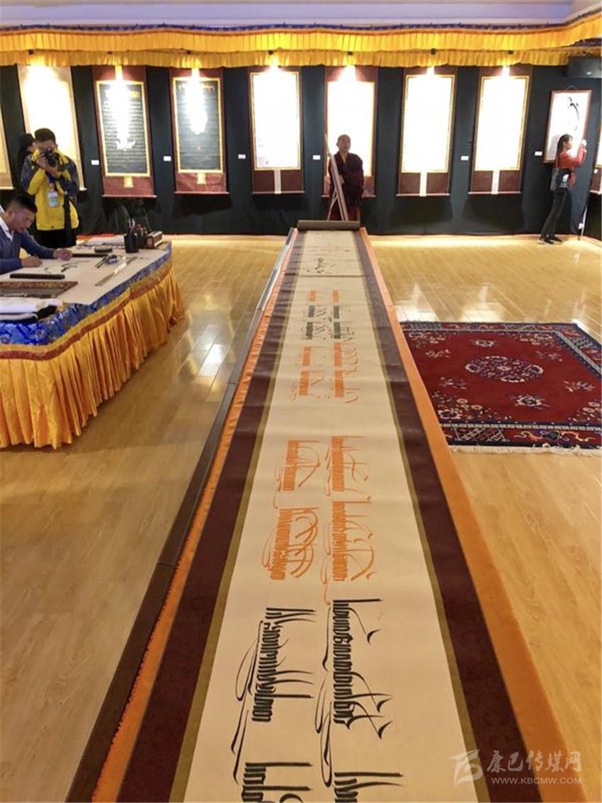 站在“倉央嘉措詩歌藏文書法百米長卷”面前,來自成都的徐賢前感嘆到:“我一直都很喜歡倉央嘉措的詩歌,但從來沒有想過可以通過書畫的形式來展現(xiàn)倉央嘉措詩歌,雖然我看不懂藏文,但是依然感到震撼,這次我真是不虛此行??!”據(jù)了解,在詩歌節(jié)期間,理塘縣電子商務(wù)孵化中心書畫文化廳內(nèi)展出由縣級(jí)非遺卓擦?xí)▊鞒腥?、縣級(jí)非遺噶瑪嘎孜派唐卡傳承人、縣書法協(xié)會(huì)成員等集合而成的近60幅藏漢書畫作品。其中,首次對外展出的“倉央嘉措詩歌藏文書法百米長卷”引來了眾多參觀者的圍觀。