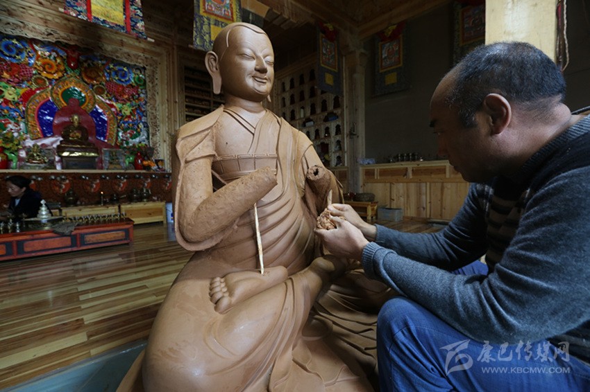 見到克村時,他正在鄰村一農(nóng)戶的經(jīng)堂里制作佛像,盤坐在蓮花寶座上的宗喀巴大師和兩個弟子身披袈裟手持經(jīng)書的泥塑作品神形兼?zhèn)?,這是克村和徒弟多登近半個月的心血??舜遄诓級|上,心無旁騖神情專注地,用木制工具對作品進(jìn)行打磨,旁邊擺放著一盆清水和一筐自制的工具。