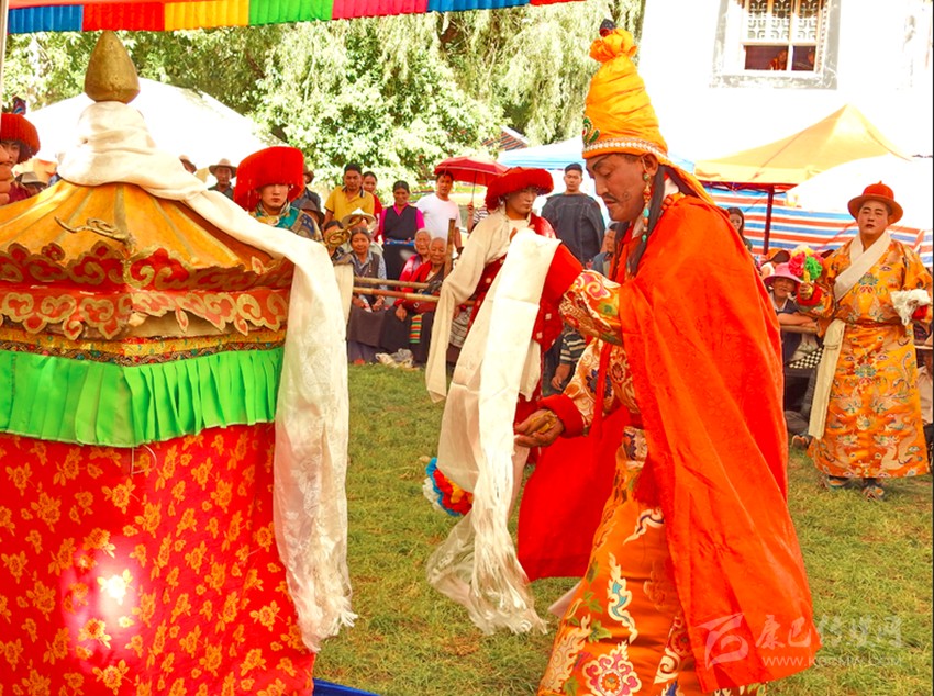 初次看到巴塘藏戲是康巴衛(wèi)視藏歷春晚,原以為是寺廟舞蹈,在唱聲杳杳里類似川劇的喉腔讓我覺得新奇,于是找些資料看看了巴塘藏戲介紹。藏戲的開山鼻祖唐東杰布。藏民歷來(lái)把他看作是創(chuàng)造藏戲的戲神和修建橋梁的鐵木工匠的“祖師”,是藏族人民心目中智慧、力量的化身。他將佛教經(jīng)典中的傳記同民間傳說、神話故事等內(nèi)容融在一起,創(chuàng)作出一種具有人物性格和舞蹈、唱腔相結(jié)合的表演藝術(shù),使過去單一的跳神舞逐漸地戲劇化,表現(xiàn)手段也不斷加強(qiáng),并從宗教儀式中分離出來(lái),形成了藏劇藝術(shù)的雛形。